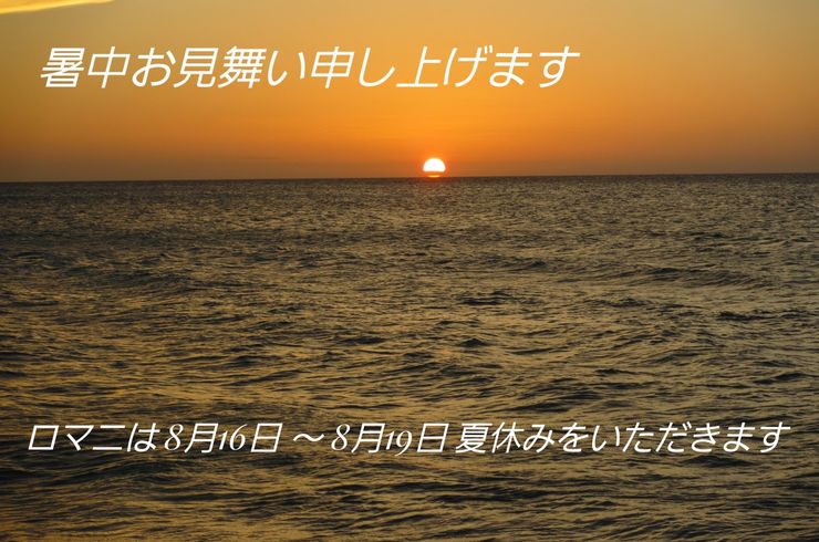 2024/08/07目黒 バー ロマニは いつも月曜日が定休なのですが 8月は 16日 ~ 19日の間 夏休みをいただきます。 北の大地でロックを聴いて 美味い料理と酒で リフレッシュしてきます。 ご了承下さいませ。 -